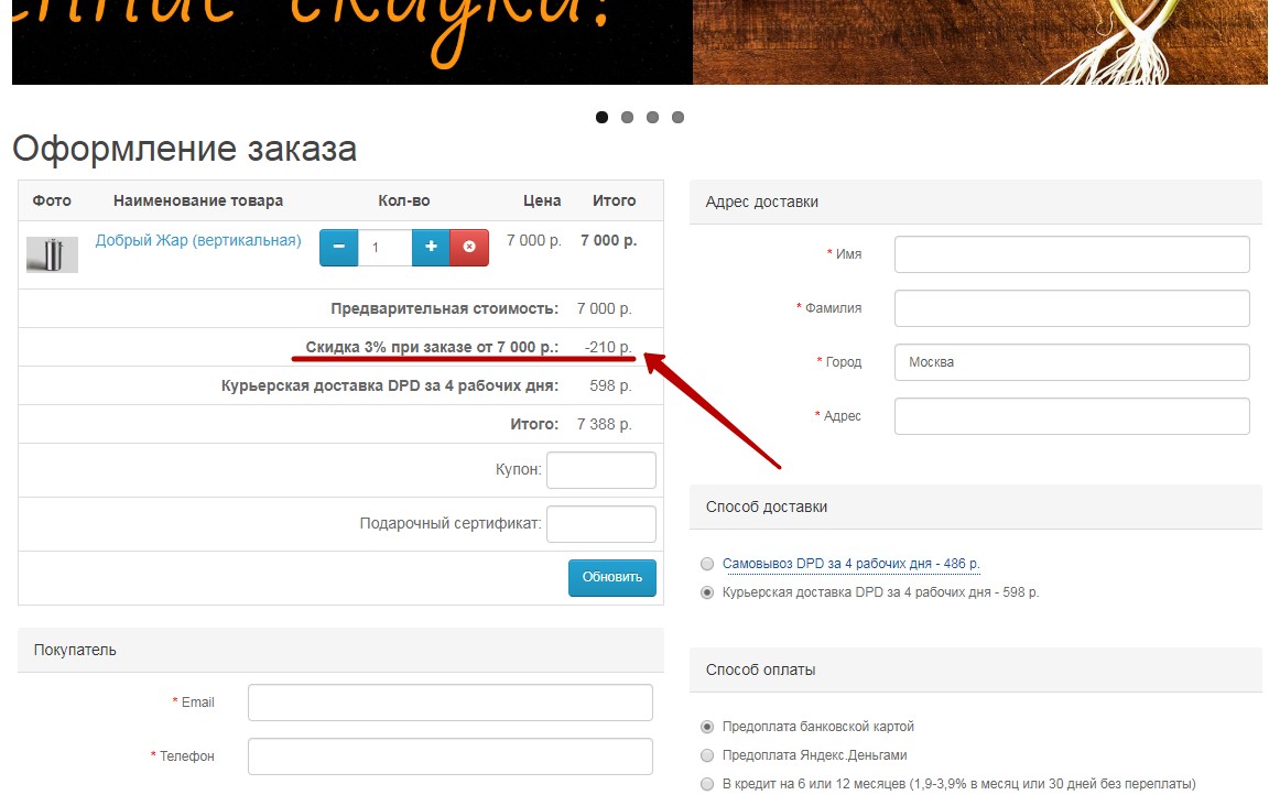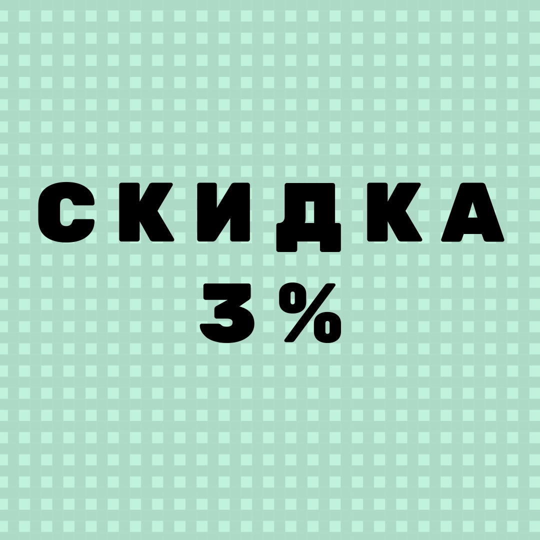 Добавьте в корзину товаров на сумму 7000 рублей или более и получите скидку 3%. Она будет рассчитана автоматически при оформлении заказа и будет суммироваться со всеми скидками по акционным товарам и промокодам.